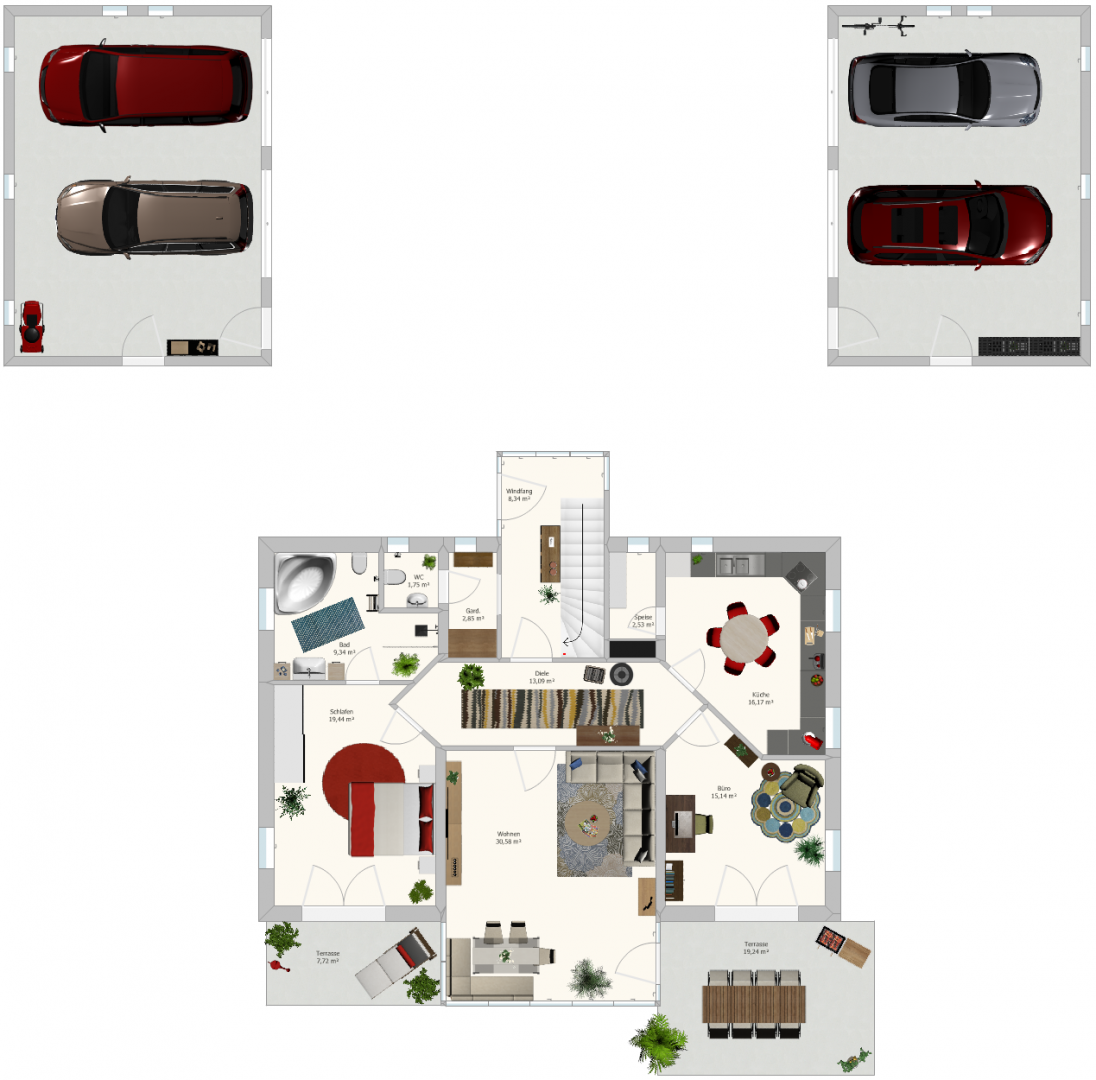Im Erdgeschoss bildet der weitläufige Wohn- und Essbereich mit vorgelagertem Wintergarten das lichterfüllte Herzstück des Hauses: großzügig, einladend und mit nahtlosem Übergang zur Terrasse und in den Garten. Die angrenzende Küche mit praktischer Speisekammer lädt zu alltäglichen Kochroutinen ebenso ein wie zu geselligen Abenden. Ergänzt wird diese Ebene durch ein Schlafzimmer sowie ein Tageslichtbad mit Dusche und Badewanne – komfortables Wohnen auf einer Ebene, elegant gelöst.