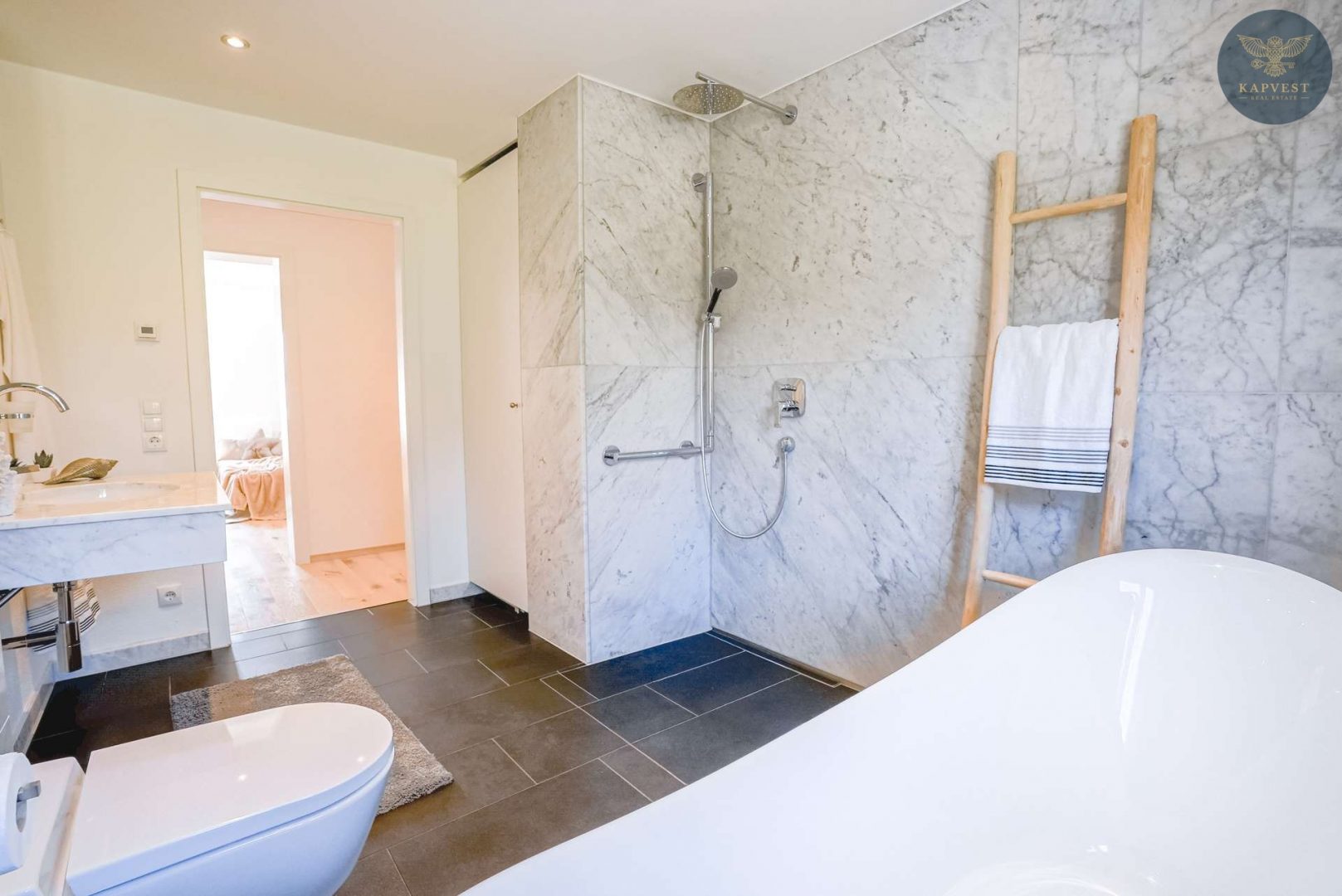 Besonderes Highlight ist das luxuriöse Badezimmer mit Carrara Bianco Marmor, Granitboden, bodengleicher Walk-In-Regendusche und freistehender vergoldeter Badewanne – ein echter Spa-Charakter.