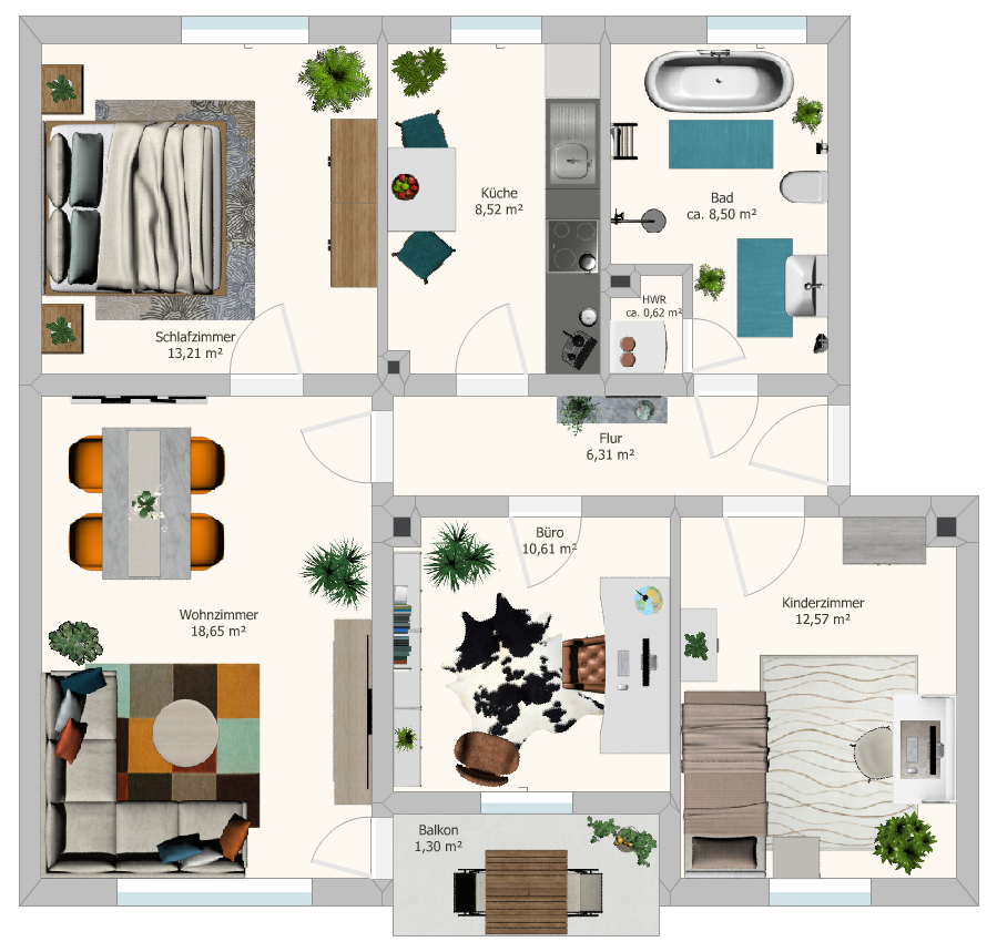 Der großzügige, lichtdurchflutete Wohnbereich mit neuem Eichenparkett und direktem Balkonzugang bildet das Herzstück der Wohnung. Vier gut geschnittene Zimmer ermöglichen flexible Nutzung als Schlafzimmer, Kinderzimmer, Homeoffice oder Wohn-Essbereich.